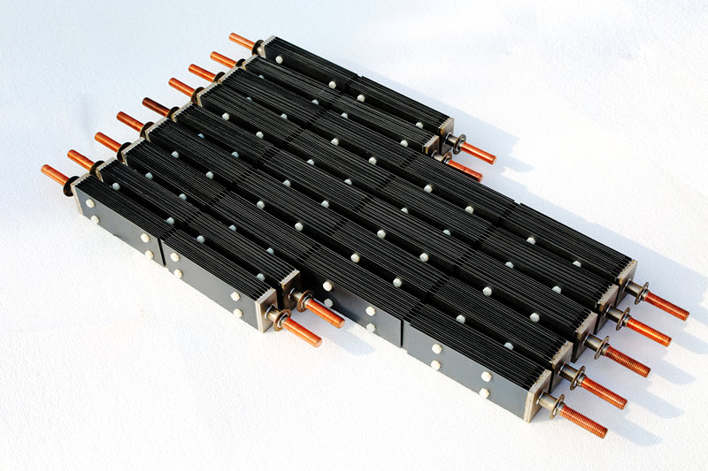 陽極材料可以選用涂層鈦電極。混合氧化物涂層鈦陽極,使用壽命長,此種涂層鈦陽極的過電位也比較低,析氯電流效率高,節能效果好。